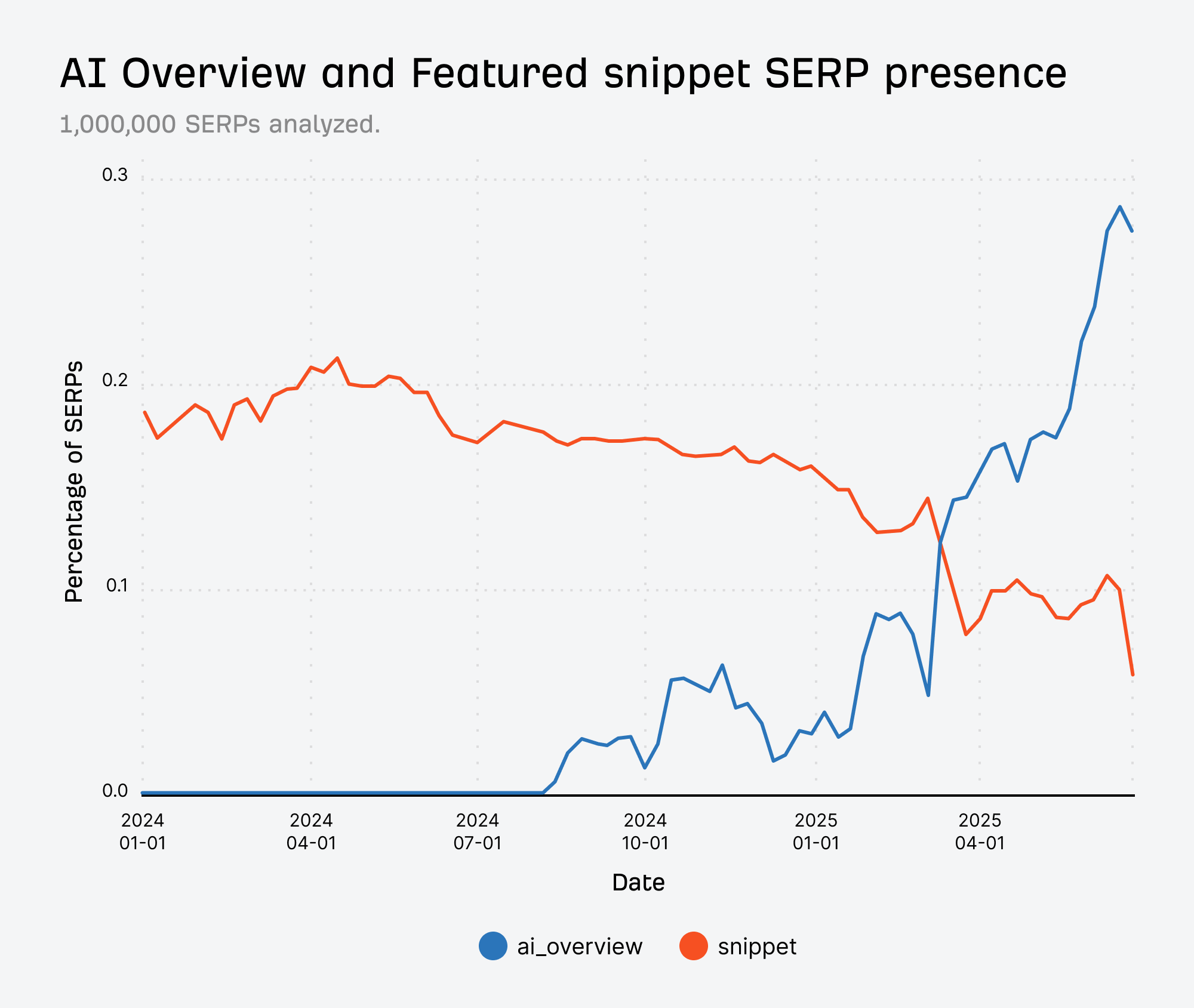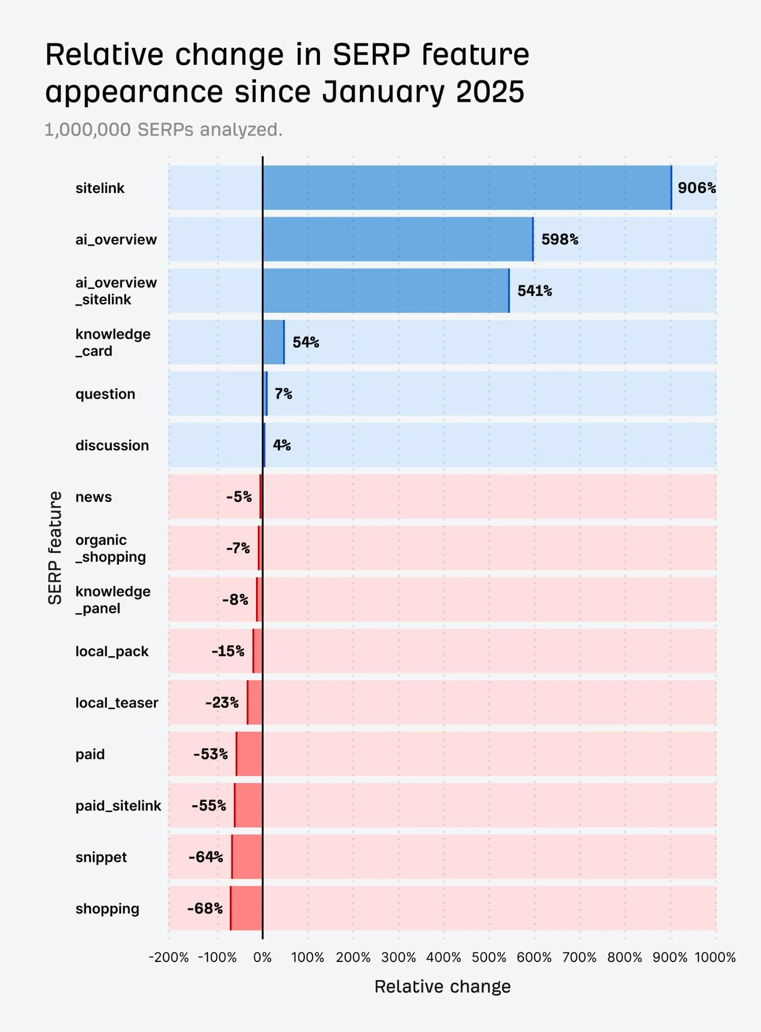 AI Overviews appeared in just 3.5% of US queries at the start of the year. By mid-June, that number had exploded to 27.4%. That’s a 598% increase in just a few months.